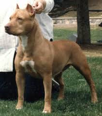 Staffordshire bull terriers are another breed to discuss. Basically, they are descended from the same dogs as the APBT, but stayed in a separate gene pool since they were mostly limited to the United Kingdom. Unfortunately, over the years Staffies have undergone many different breeding practices that leave them so varied in size and shape that there is a similar split to the AmStaff vs. APBT predicament. The Kennel Club (KC) type Staffs are shorter, stockier built dogs than the working type Staff, which is a more lean and slightly taller version, very similar to the APBT. The working type Staffs have had to fulfill the role vacated by the APBT, since APBTs are outlawed in the UK. This leaves the show types to continue on a downward spiral away from the breed's original standard. However, there are still breeders who strive to continue breeding the working type Staffs. Here are some pictures of different Staffies. You can clearly see the difference between the show type and the working type.